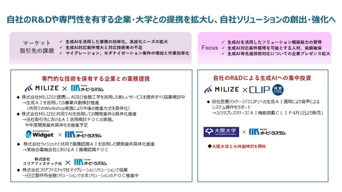 近年、ソフトウエア開発において生成AIのコンセプトが広がりを見せ、生産性や品質向上が期待されています。オービーシステムは、2024年の10月に発表予定の中期経営計画に、成長戦略のひとつとして「新事業の創出・拡大」を掲げています。そのため、R&Dの強化や業務提携の拡大を通じて事業の成長を加速させる考えです。特に、生成AIの活用によるソフトウエア開発の応用や新たなビジネスモデルの創造を模索しています。