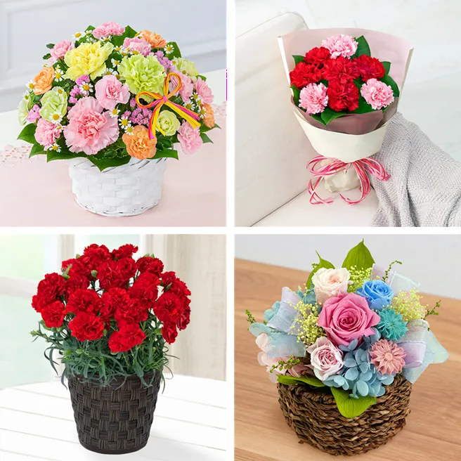 花キューピットでは、選ばれた「赤」に加えて、今年初めて登場した「青のカーネーション」など、多彩なカラーバリエーションを用意しており、お母さんの個性に合わせたギフト選びを提案しています。