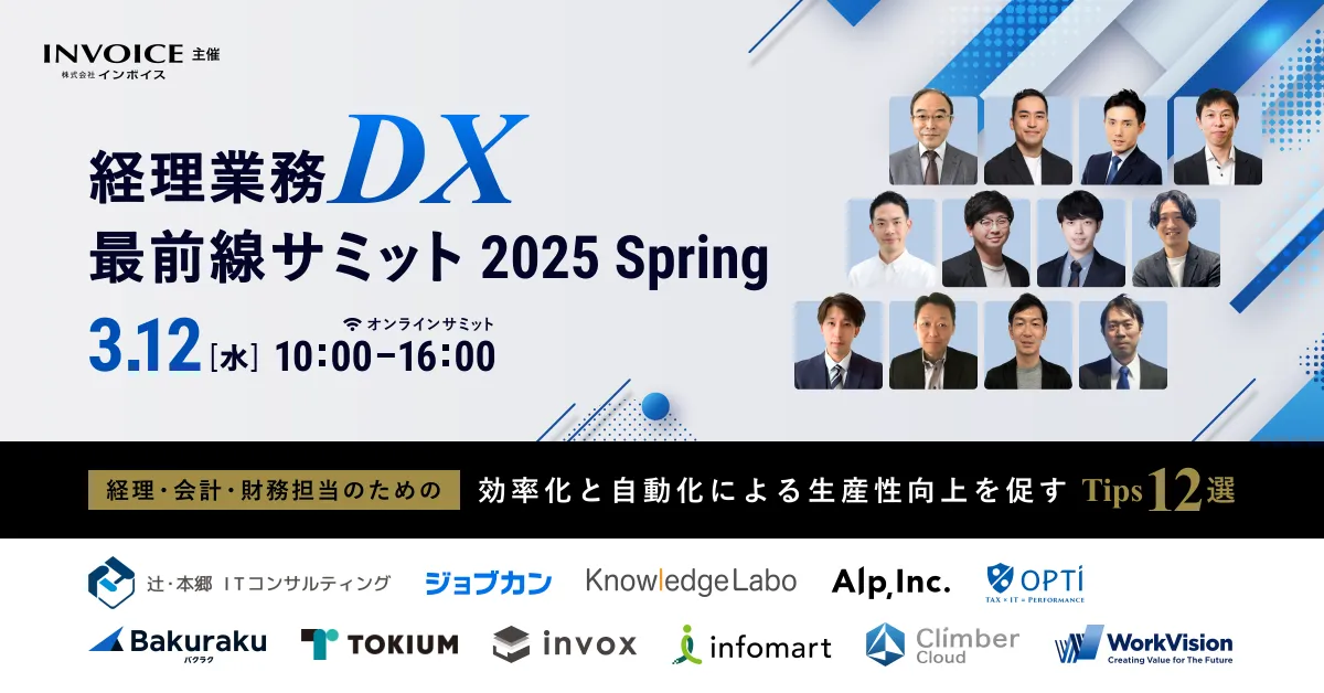 株式会社インボイスは、2025年3月12日(水)に「経理業務DX最前線サミット 2025 Spring」を開催します。このオンラインイベントは、経理・会計・財務の担当者に向けて、業務効率化と自動化に役立つ知識やヒントを提供することを目的としています。