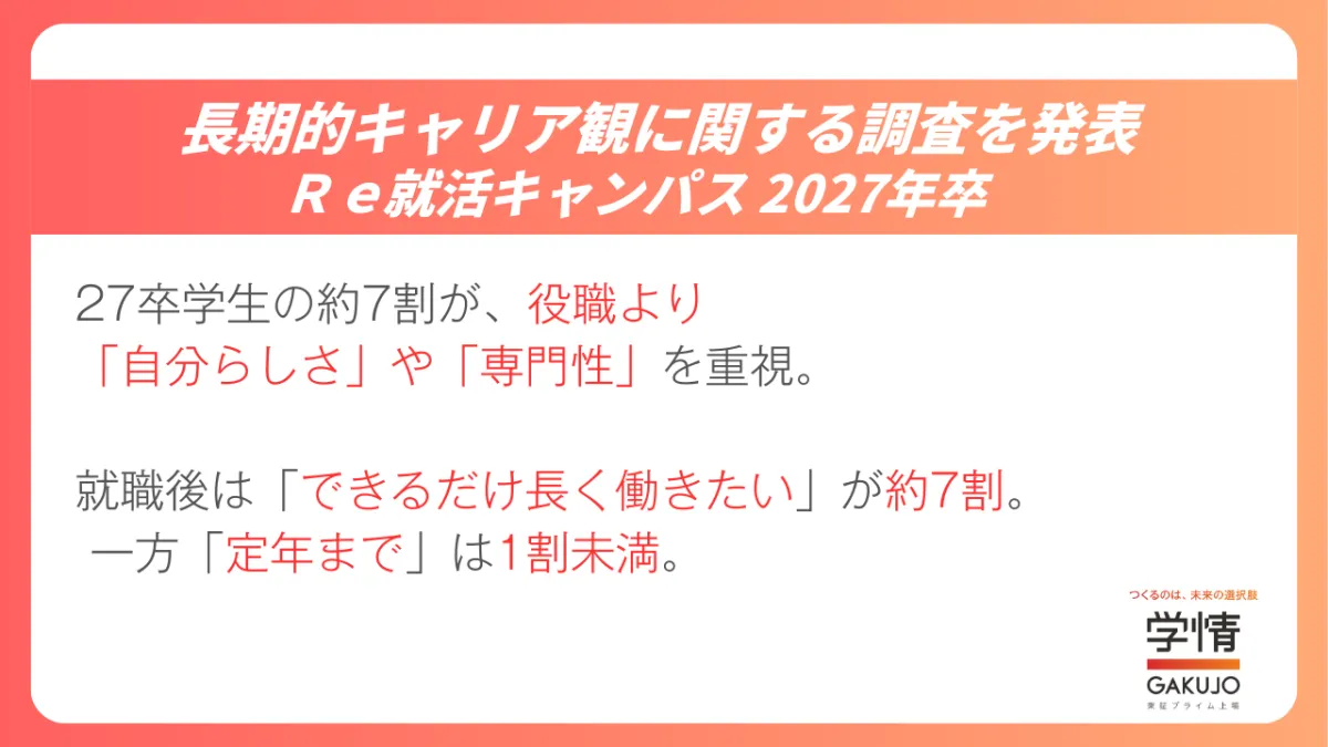 近年、就職活動の早期化が進む中、大学生のキャリア観は多様性を増しています。伝統的に重視されてきた役職や昇進ではなく、「自分らしさ」や「専門性」が求められるようになっています。この変化は、2027年卒業予定の学生を対象に行った調査によって浮き彫りになりました。