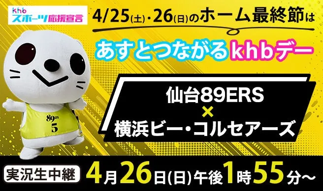 ホーム最終戦となる4月26日(日)の試合は、khbにて13時55分から16時15分まで生中継されます。テレビの前で、または会場で「仙台89ERS」を応援しましょう。また、この試合の生中継には注目の試合局が加わり、全国のマスコミも注目することで、さらに注目度が増すことが予想されます。
