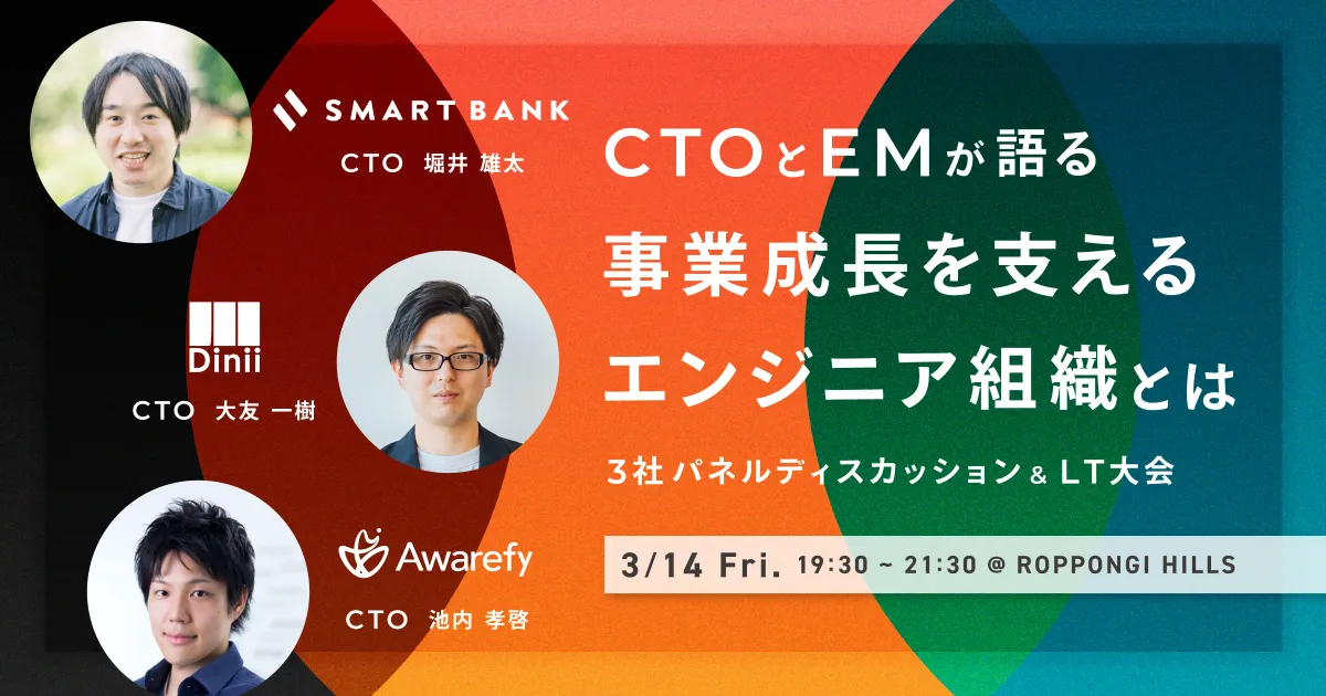 2025年3月14日、東京都六本木にある六本木ヒルズ森タワーにて、エンジニア組織に関する注目のイベント「CTOとEMが語る 事業成長を支えるエンジニア組織とは」が開催されます。本イベントは株式会社Awarefy、株式会社スマートバンク、株式会社ダイニーの合同主催で、これまでにないエンジニアリングのリアルな課題や成功事例について触れる貴重な機会となります。