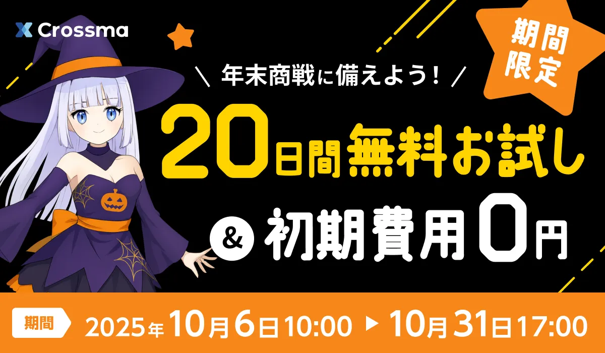 株式会社IZUMIが提供するオンラインサービス『クロスマ』が、2025年10月6日(月)よりハロウィンをテーマにした特別キャンペーンを実施します。このキャンペーンでは、特に新規のお客様向けに、通常の初期費用30,000円が無料となり、さらに通常7日間のところをなんと20日間もじっくりとサービスを体験できます。