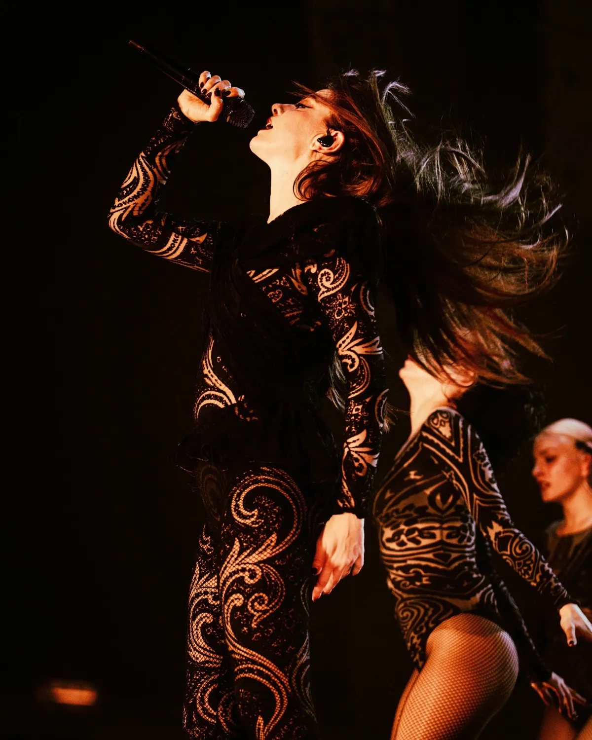 公演のハイライトは、空中に浮かぶパフォーマンスシーンでした。アンナリーザは、肩から流れるデヴォレシフォンで作られたロングケープを身にまとい、幻想的な存在感を示しました。このロングケープは、彼女の動きに合わせてふわりと広がり、舞台に神秘的な雰囲気をもたらしました。観客はその美しさに息を飲み、まるで彼女が空中を舞っているかのように感じました。
