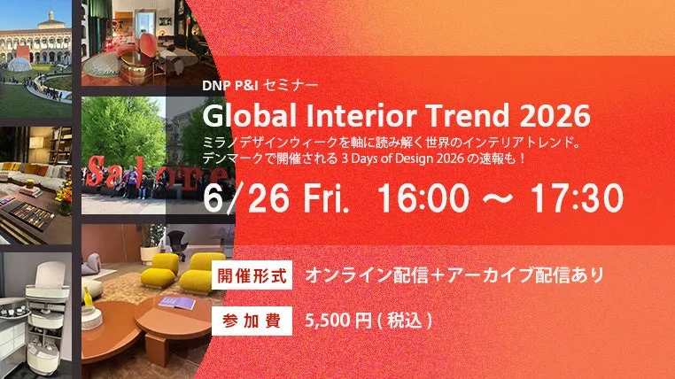 大日本印刷株式会社(DNP)は、2026年6月26日、ミラノを中心とした最新のインテリアトレンドを紹介するオンラインセミナー「Global Interior Trend 2026」を開催します。このセミナーは、DNPが20年以上取材してきた「ミラノデザインウィーク」からの貴重な情報を基にしており、トレンドの分析を通じて新たなライフスタイル提案を行います。