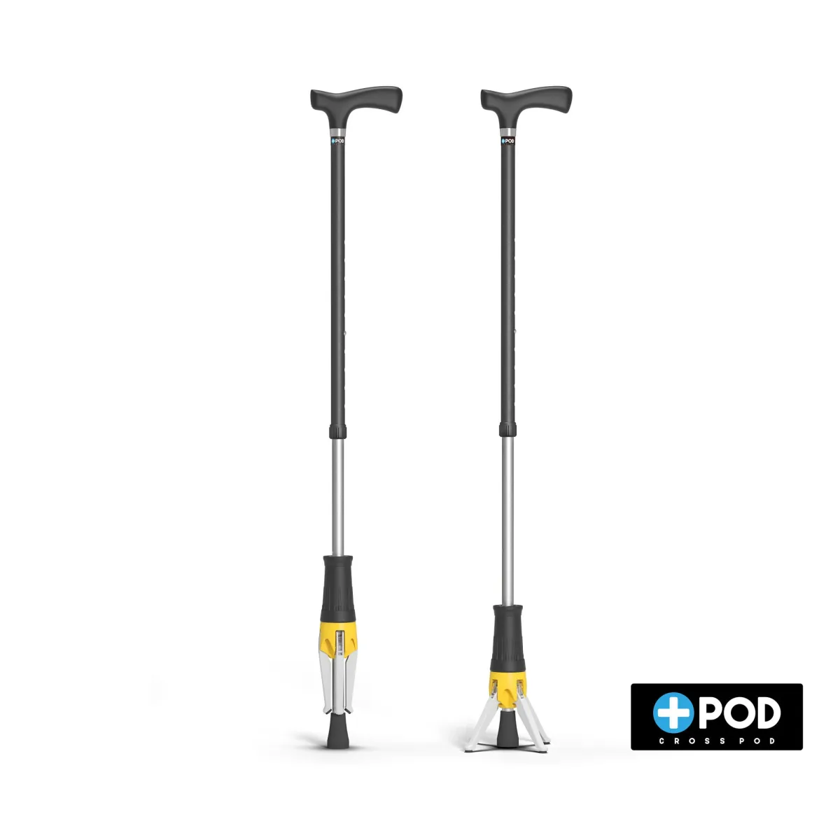 クロスポッドは、杖としての機能と自立性を兼ね備えた製品です。従来の1点杖として使用する際には、ユーザーが違和感なく歩行できるようにデザインされています。さらに、使用しない時には、脚を開いて安定して立てられるため、どんな場所でも困ることがありません。特に、開閉式の脚ユニットは軽量であり、全体の重量はわずか360gと持ち運びにも便利です。開閉操作も非常に簡単なので、年齢に関わらずどなたでも使用しやすい構造になっています。