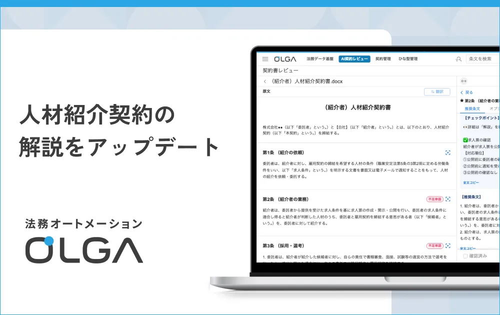GVA TECH株式会社が提供する法務オートメーション「OLGA」が、より良いユーザー体験を実現するために人材紹介契約の解説を更新しました。OLGAは、契約管理やナレッジ活用を一体で支援するツールとして、特に法務担当者や弁護士にとって貴重なリソースです。
