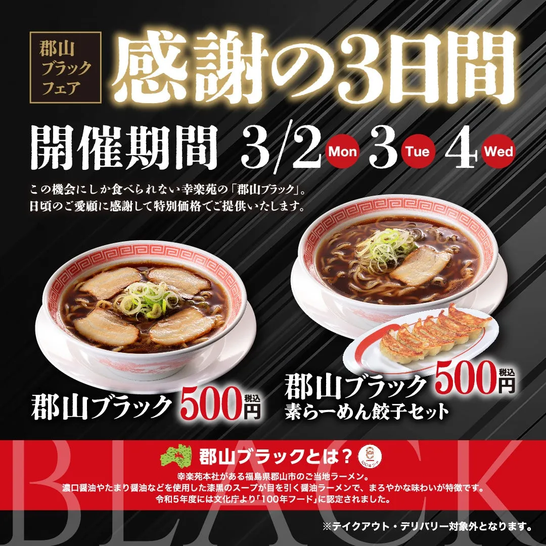 福島県郡山市で、人気のご当地ラーメン「郡山ブラック」を楽しむ特別な3日間が企画されました。この「郡山ブラックフェア」は、株式会社幸楽苑によって行われ、2026年3月2日(月)から3月4日(水)の間、全店舗で実施されます。
