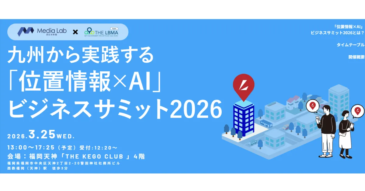 2026年3月25日、水曜日に福岡市で開催される「位置情報×AI」ビジネスサミット2026の全プログラムが発表されました。このサミットは、株式会社西日本新聞メディアラボと一般社団法人LBMA Japanが共催するもので、位置情報とAIを活用した実践的な知見が得られる場となります。