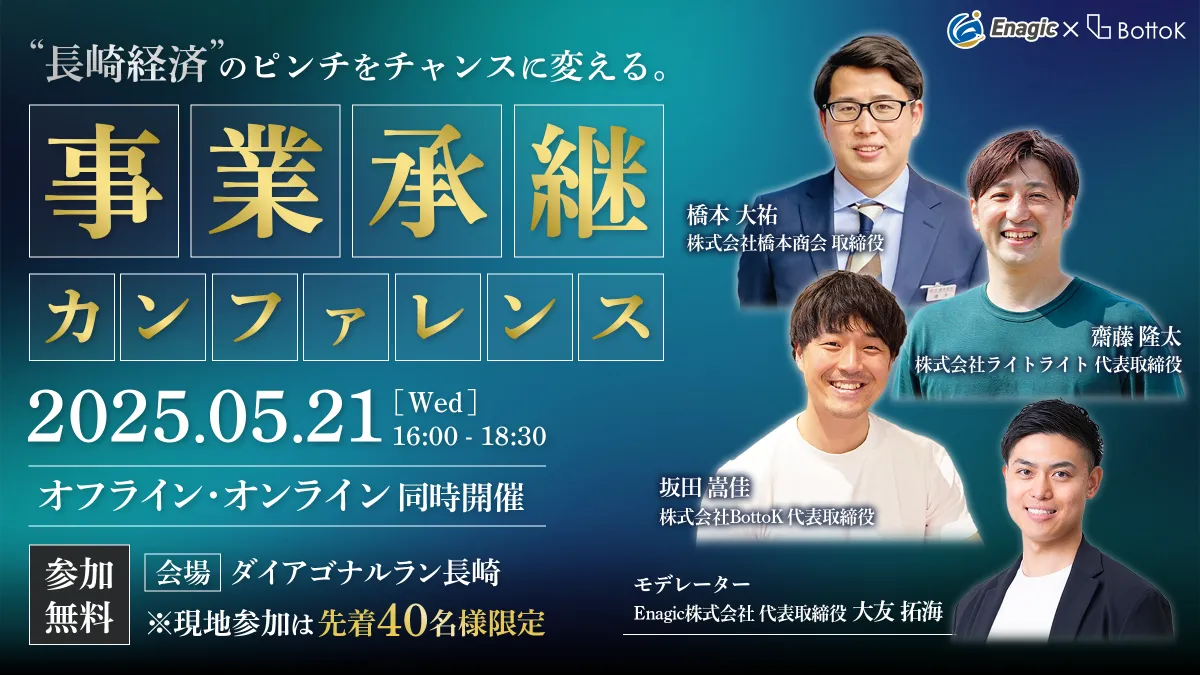 2025年5月21日、長崎県長崎市のダイアゴナルラン長崎で、特別なカンファレンスが開催されます。このイベントは、「長崎経済のピンチをチャンスに変える。事業承継カンファレンス」と題され、Enagic株式会社が主催します。長崎を拠点とする企業が抱える事業承継に関する課題や解決策を探る貴重な機会です。