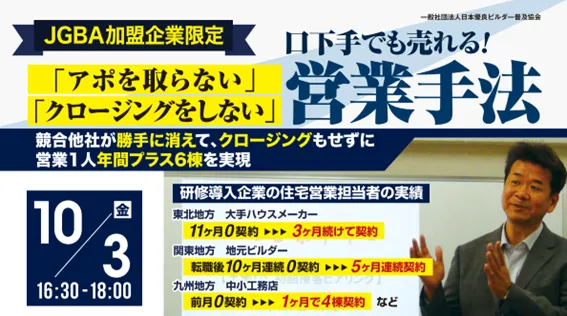 2023年10月3日、一般社団法人日本優良ビルダー普及協会(JGBA)が主催するセミナー「口下手でも売れる!『アポを取らない』『クロージングをしない』営業方法」が開催されました。このセミナーは、リアルとオンラインで行われ、合計79名の参加者が集まりました。セミナーの講師には、JGBAの賛助会員である株式会社FRUORの代表取締役石川智忠氏が登壇しました。石川氏は多様な業種での経験を基に、「売ろうとせず」「クロージングを放棄する」という新たな営業スタイルがどのように実現されるかを解説しました。