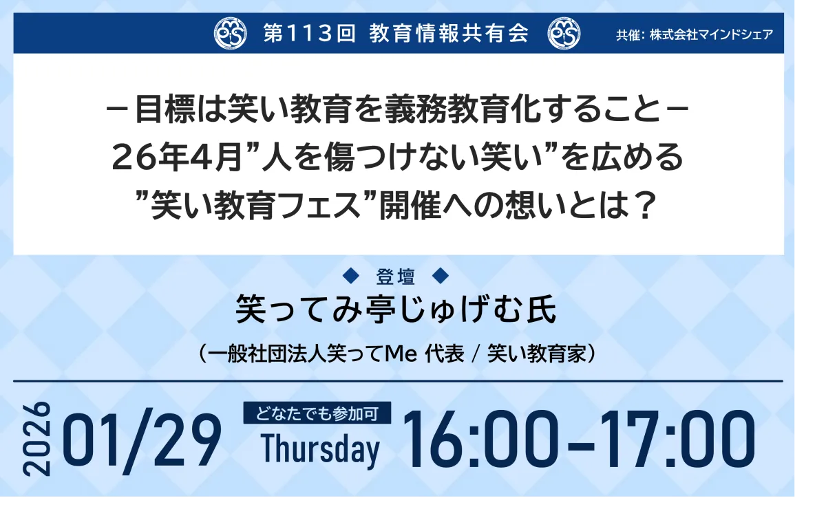 2026年1月29日に、笑い教育をテーマにした第113回教育情報共有会が開催されることになりました。このイベントでは、一般社団法人「笑ってMe」の代表であり笑い教育家のじゅげむ氏が登壇し、コミュニケーション手法としての笑いの重要性について語ります。この企画は、教育機関における認識を深め、知識を共有することを目的としています。