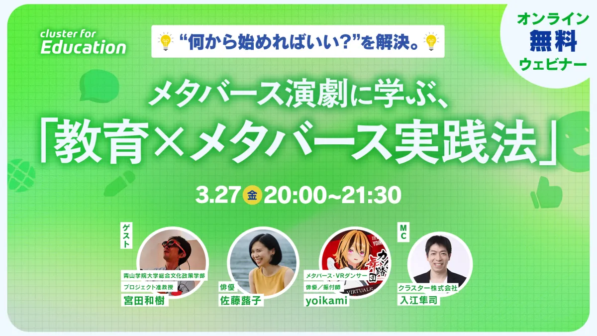 日本最大級のメタバースプラットフォーム「cluster」を運営するクラスター株式会社は、教育関係者向けのオンライン無料ウェビナーを2026年3月27日(金)20:00より開催します。このウェビナーは、教育現場におけるメタバースの活用方法を探るもので、特に「何から始めればいいかわからない」といった悩みを抱える方々に向けて実践的なアドバイスを提供することを目的としています。