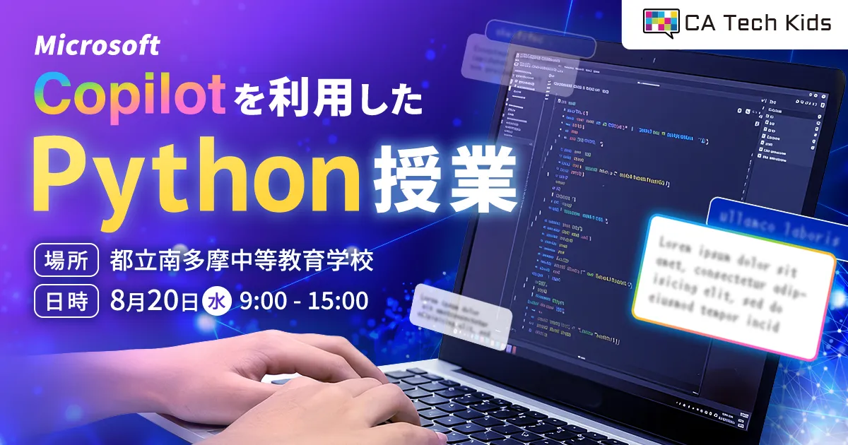2025年8月20日(水)、東京都多摩市に位置する都立南多摩中等教育学校にて、株式会社CA Tech Kidsが主催するMicrosoft Copilotを用いたPython講座が行われます。この講座は、生成AIを駆使した最新の教育手法を体験する機会であり、教育に関心のある方々に広く公開される視察イベントです。