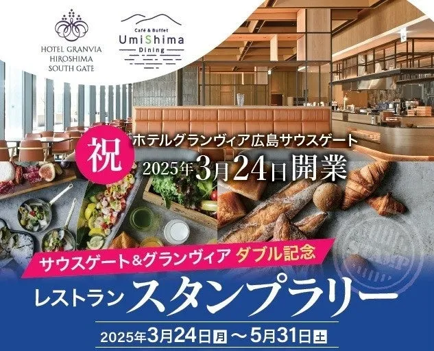 「サウスゲート&グランヴィアダブル記念レストランスタンプラリー」は、2025年3月24日から5月31日までの期間中、ホテル内の2つのレストランを利用することで参加することができます。参加者は、サウスゲートの「Café&Buffet UmiShima Dining」と、グランヴィアの直営レストランから1店舗を選び、合計2店舗を利用します。スタンプを2つ集めた参加者の中から、抽選で30組60名にサウスゲートの宿泊券やレストラン券が贈られます。