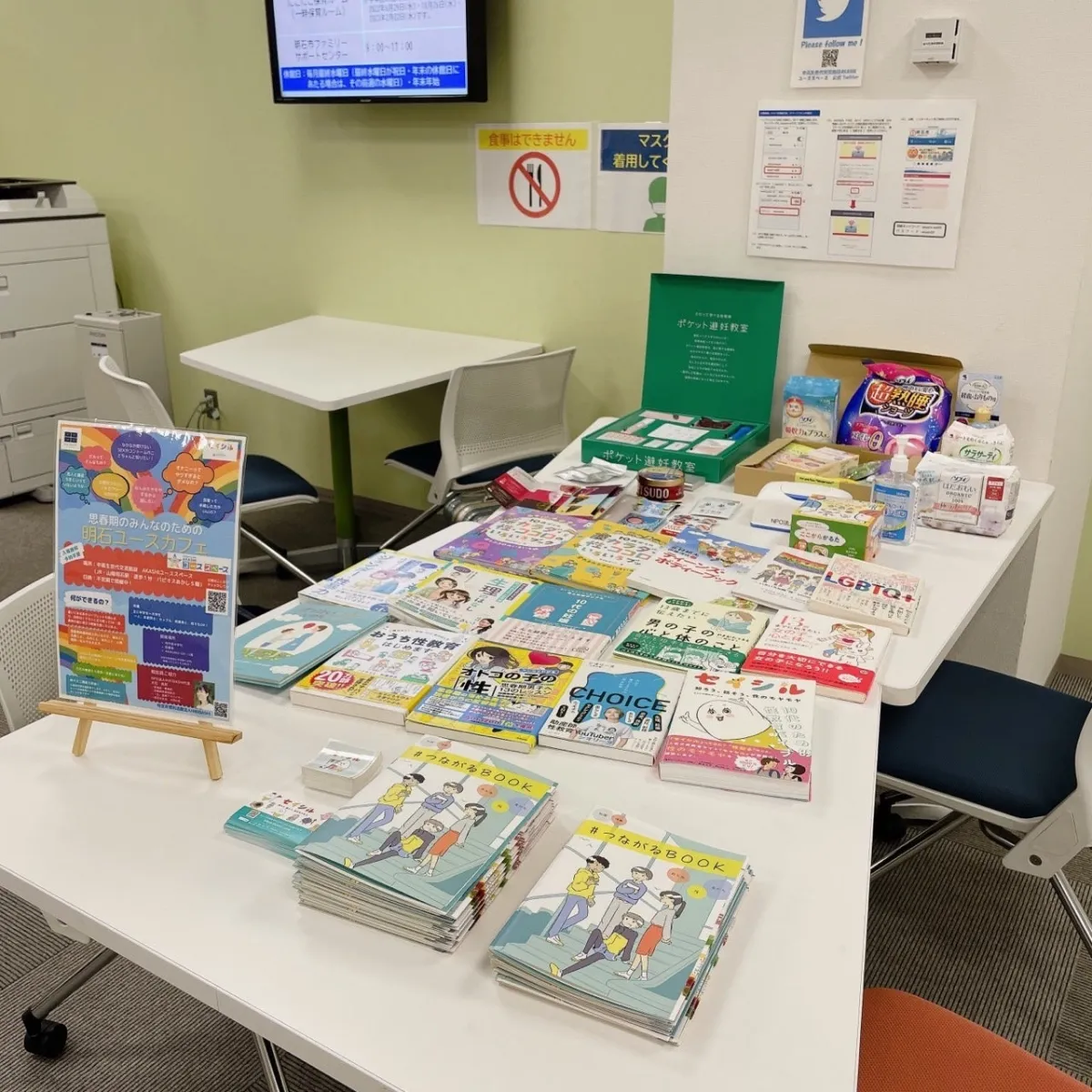 「出張ユースカフェ」では、看護師・保健師・思春期保健相談士である代表の大石真那氏が相談に応じています。性に関する知識が掲載された「#つながるBOOK」の配布や、若者向けの書籍、コンドーム、生理用品なども用意されています。