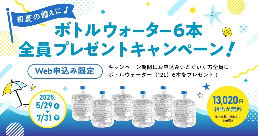 2025年5月29日(木)から7月31日(木)までの期間限定で、「初夏の備えに♪ボトルウォーター6本 全員プレゼントキャンペーン」が開催中です。この期間中に「うるのん」の公式ホームページから新規で申し込んだ方全員に、大容量12リットルのボトルウォーターがなんと6本も無料でプレゼントされるという、見逃せない内容となっています。