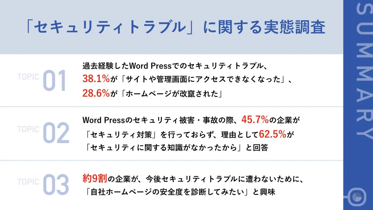 WordPressを利用する企業において、セキュリティに関する実態調査が行われました。この調査は、WordPressを利用している経営者や担当者105名を対象に、2022年1月21日から23日の間に実施されました。セキュリティトラブルの経験者を中心に、具体的な被害状況や対策について分析しました。