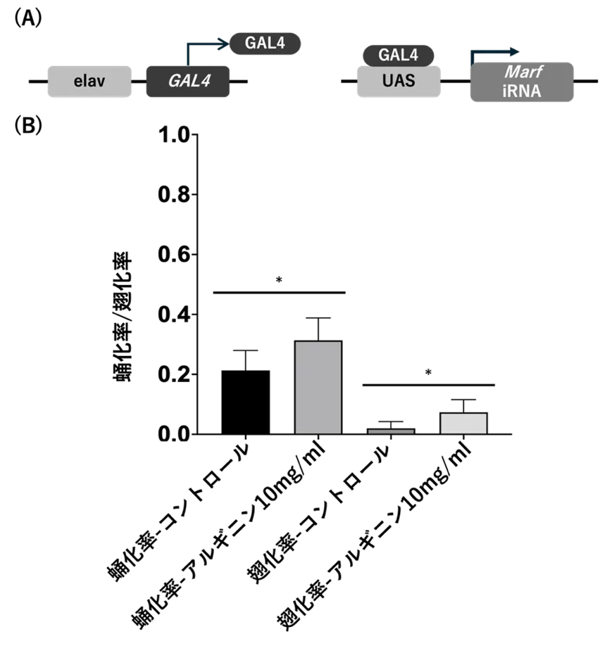 実験の結果、高用量のL-アルギニン(10mg/mL)を投与することで、ショウジョウバエにおける蛹化率や羽化率が有意に改善されました。特に、運動機能に関してもL-アルギニン投与群では明らかな改善が観察され、日数が経過するにつれてその効果が持続しました。
