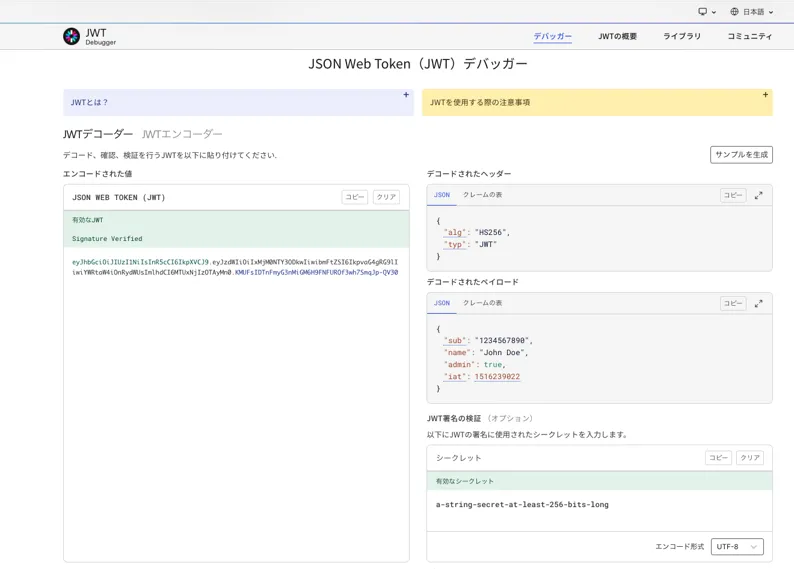 シークレットや秘密鍵での署名に対応 し、UTF-8やbase64urlエンコードにも対応しています。