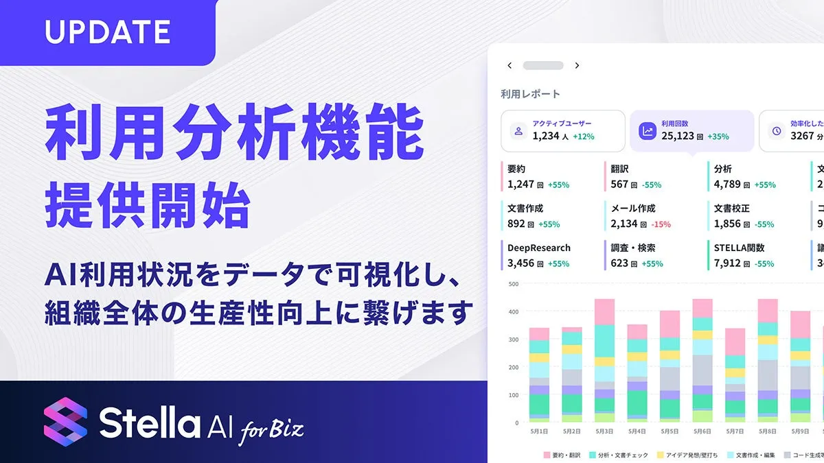生成AI技術の進化が進む昨今、株式会社SUPERNOVA(東京都港区)は、「Stella AI for Biz」に新たに追加した従業員の利用状況分析機能を2026年1月6日(火)より提供開始します。この機能は、企業における生成AIの導入を支援するために作られており、利用状況の可視化や効果測定が可能になります。