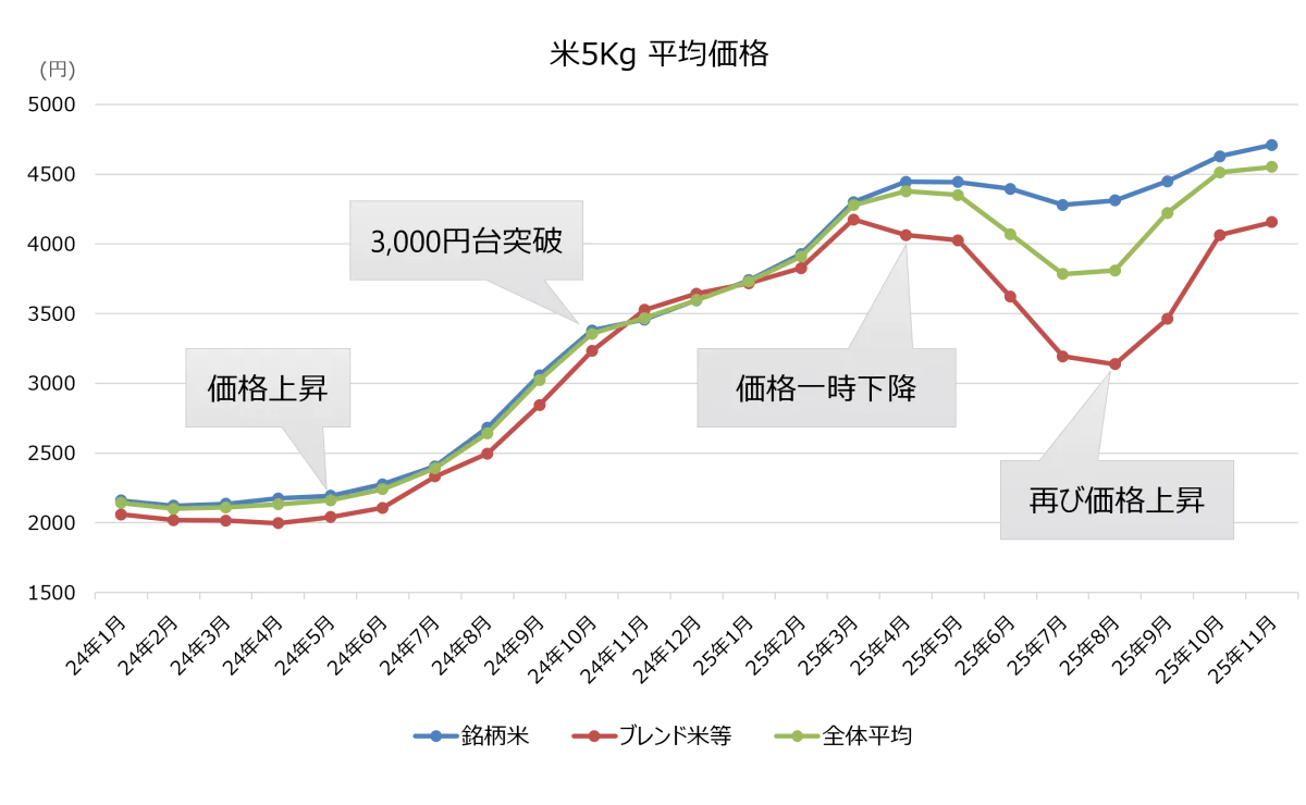 2025年の米市場において、平均価格は過去最高となりました。特に、平均価格が初めて3,000円台を突破したのは2024年の10月であり、これは消費者の購買行動に大きな影響を及ぼしました。特に、2025年の11月においては、全体平均価格が約4,553円、銘柄米は約4,709円と、いずれも高値を記録しました。この価格上昇は前年同月比で31%の上昇となり、前年からの変化がいかに深刻であったかを物語っています。