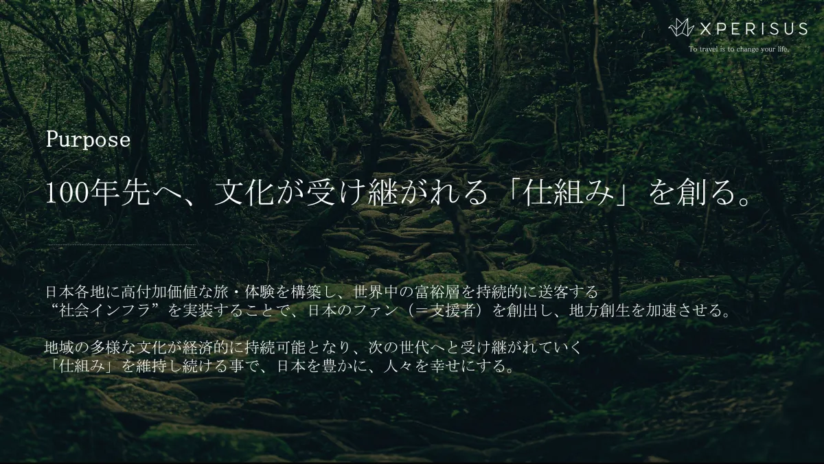 エクスペリサスの新たなPurposeとして、中核に据えられたのは「100年先へ、文化が受け継がれる『仕組み』を創る」という理念です。この理念は、全国各地の高付加価値な旅や体験を構築し、それらを通じて世界中の富裕層を持続的に誘致することを目的としています。このアプローチは、地域の多様な文化を経済的に持続可能なものにし、日本を豊かにするための「仕組み」を創出することにつながります。