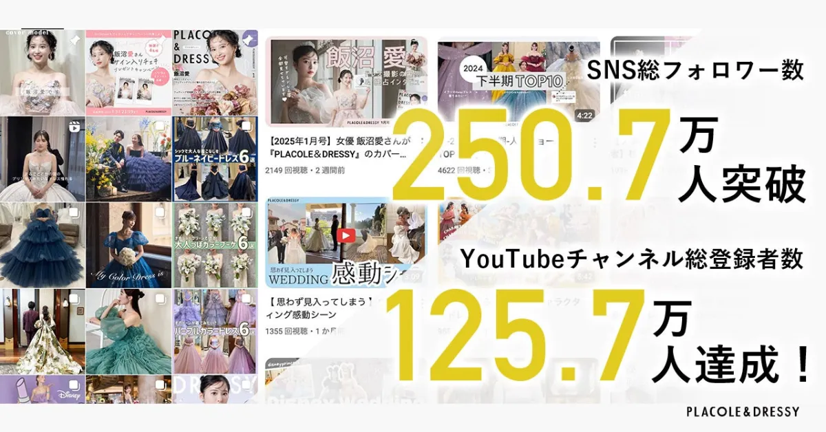 2025年1月の時点で、プラコレのSNSアカウント群は合計で250.7万人のフォロワーを獲得しました。また、YouTubeチャンネルは125.7万人以上の登録者数を誇っています。これらのアカウントは主に20代〜30代の女性に向けて、魅力的なウェディングドレスの情報やトレンドを発信しております。