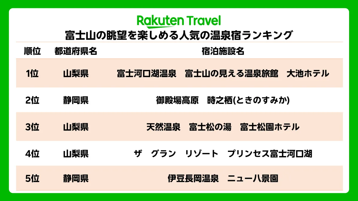 楽天グループ株式会社が提供する旅行予約サービス「楽天トラベル」は、特別な宿泊体験を提供するために「富士山の眺望を楽しめる人気の温泉宿ランキング」を発表しました。このランキングは、富士山を眺めることができる客室を有する宿泊施設を対象に、宿泊実績に基づいて作成されました。2024年10月1日から2025年9月30日までの実績に基づき集計されています。今回は、その中から選ばれた上位のお宿を詳しく紹介します。