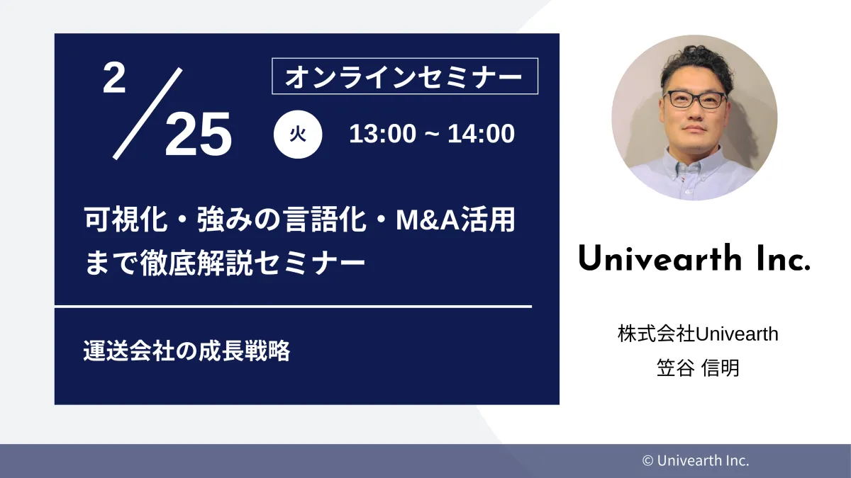 2025年2月25日(火)、物流業界に特化したオンラインセミナー「運送会社の成長戦略:可視化・強みの言語化・M&A活用まで徹底解説」が開催されます。このセミナーは、運送会社の経営者や管理職の方々が収益向上や業務改善に向けた具体的な方法を学ぶ絶好の機会です。