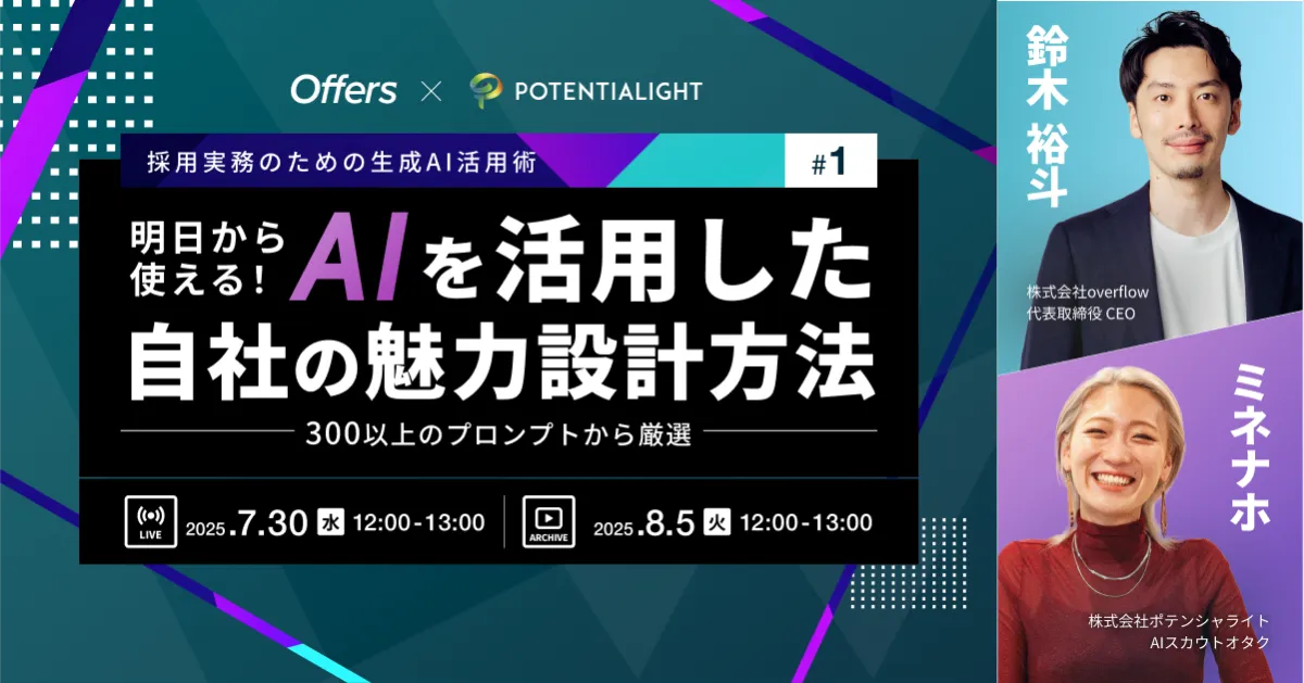 近年、企業の採用現場で生成AIの導入が進んでいますが、具体的にどのように活用するか悩む方も多いでしょう。株式会社overflowが主催するセミナー「300以上のプロンプト文から厳選!明日から使えるAIを活用した自社の魅力設計方法」が、2025年7月30日(水)にライブ配信、8月5日(火)にはアーカイブ配信されます。これにより、参加者は気軽にオンラインで専門的な知識を得ることができます。