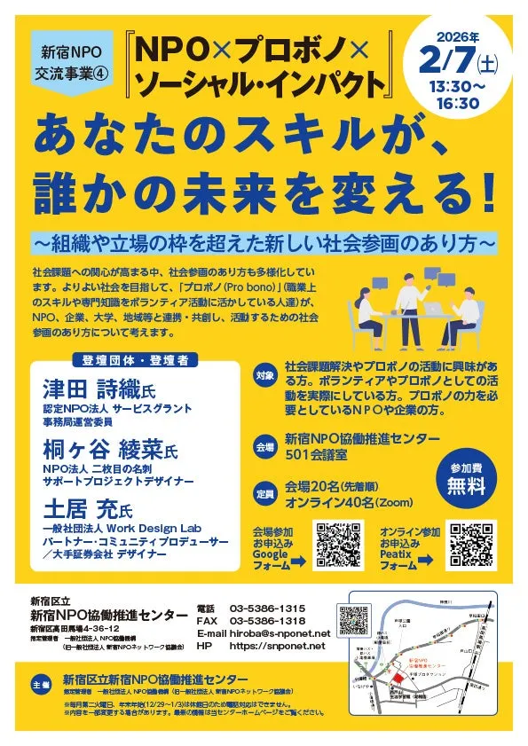 新宿NPO協働推進センターが主催する交流イベント『NPO×プロボノ×ソーシャル・インパクト』が2026年2月7日(土)に開催される。このイベントでは、「あなたのスキルが、誰かの未来を変える!」をテーマに、社会課題解決に向けた新たなアプローチが模索される。