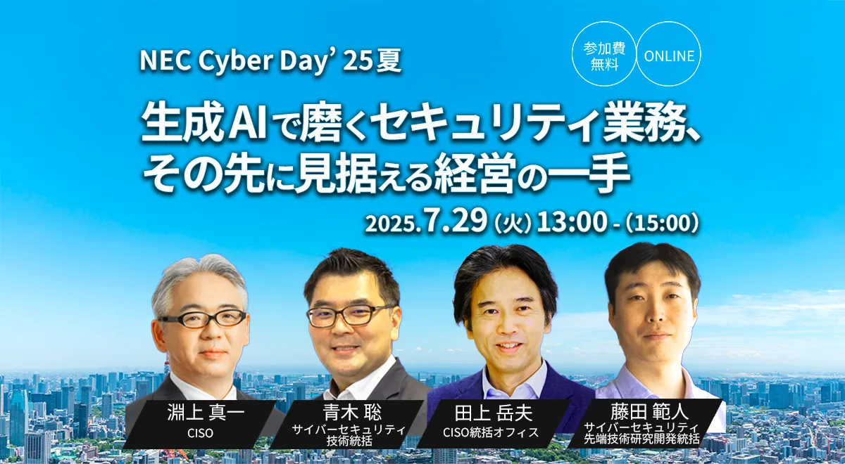 2025年7月29日、NECは「生成AIで磨くセキュリティ業務、その先に見据える経営の一手 NEC Cyber Day'25夏」というタイトルのWebセミナーを開催します。このイベントは、サイバーセキュリティ対策の効率化や高精度化を図るための生成AIの活用方法を語るものです。特に、生成AIの導入は終着点ではなく、その活用によって得られたリソースを経営戦略に再投資する重要性が強調されています。