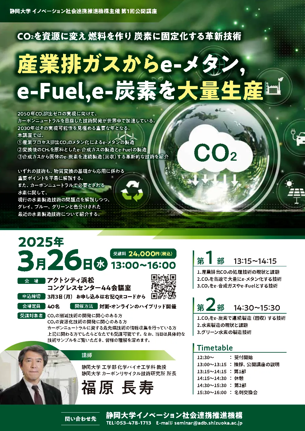 静岡大学イノベーション社会連携推進機構は、カーボンニュートラル社会の実現に向けた革新的な技術を紹介し、関心のある人々に向けた公開講座を開催します。講座のテーマは「産業排ガスからe-メタン、e-Fuel、e-炭素を大量生産」、及びそれに関連する技術についてです。この講座は、カーボンニュートラルの理念に基づいた持続可能な社会の実現に向けた重要なステップとなります。
