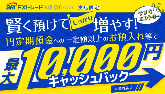 SBI FXトレードNEOBANKは、2025年10月1日から、円定期預金を利用した新しいキャッシュバックキャンペーンを開始します。このキャンペーンでは、条件を満たしたお客様に最大で10,000円のキャッシュバックを提供します。手元に直接還元されるこのお得な特典は、選択肢を広げ、貯蓄ニーズに応える絶好の機会です。