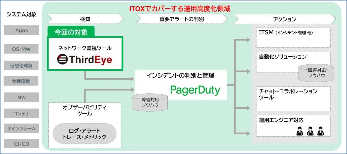 同様に、ITOXはAIを利用してシステム運用を自動化するAIOpsの考えのもと設計されたサービスです。特にインシデント管理においては、「PagerDuty」のAIが重要なアラートを自動的に振り分けるため、不要な通知を最大50%も減少させることができます。これにより、ネットワーク監視から障害対応までのプロセスをスムーズにし、初動のタイミングを大幅に短縮することが可能です。