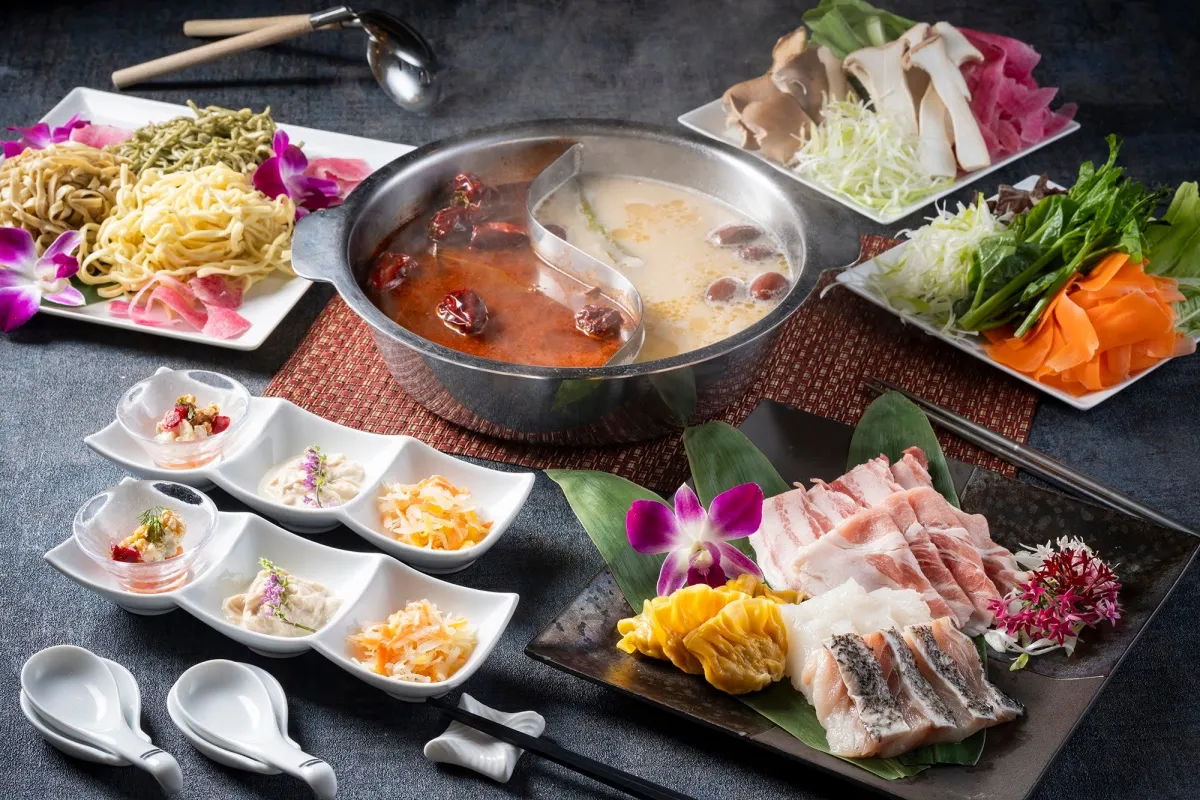 琉球火鍋は、中国料理長が薬膳の理念に基づき、こだわりのスープと具材を選び抜いています。スープは2種類あり、やんばるのスパイスを活かした「麻辣湯(マーラータン)」と、鶏の旨味が凝縮された「鶏白湯」となっています。どちらも滋味深い味わいが特徴で、陰と陽を表現した調和の取れた一品です。