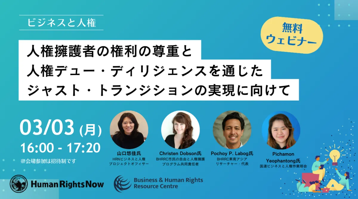 2024年3月3日(月)、オンラインと対面のハイブリッド形式で開催される「人権擁護者の権利の尊重と人権デュー・ディリジェンスを通じたジャスト・トランジションの実現に向けて」というイベントは、企業の人権尊重責任を促進することを目的としています。このイベントはビジネスと人権の観点から、今後の持続可能なビジネスモデルの形成において重要な役割を果たすでしょう。
