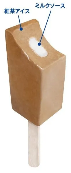 このミルクティーバーの主な特徴は、アッサム紅茶の香りと、ミルクのやさしい甘さを楽しめる点にあります。アイス部分でしっかりと紅茶の風味を感じつつ、ソースがミルクの甘さを引き立てます。見た目は紙パックのリプトンミルクティーをイメージしたデザインで、色味やシズル感も忠実に再現されています。