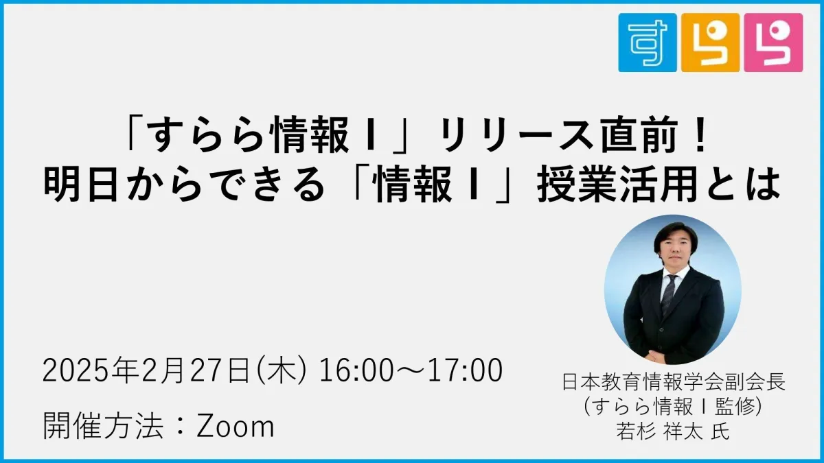 株式会社すららネット(本社:東京都千代田区、代表取締役:湯野川孝彦)は、AIを活用したアダプティブな対話式ICT学習教材『すらら』を展開し、その最新機能として高校必履修科目「情報Ⅰ」を2025年4月にリリースします。これに伴い、2025年2月27日(木)16時から無料オンラインセミナーを実施します。このセミナーでは、「すらら情報Ⅰ」の具体的な機能や特長について詳しく紹介し、実際に授業で役立つ情報を提供いたします。