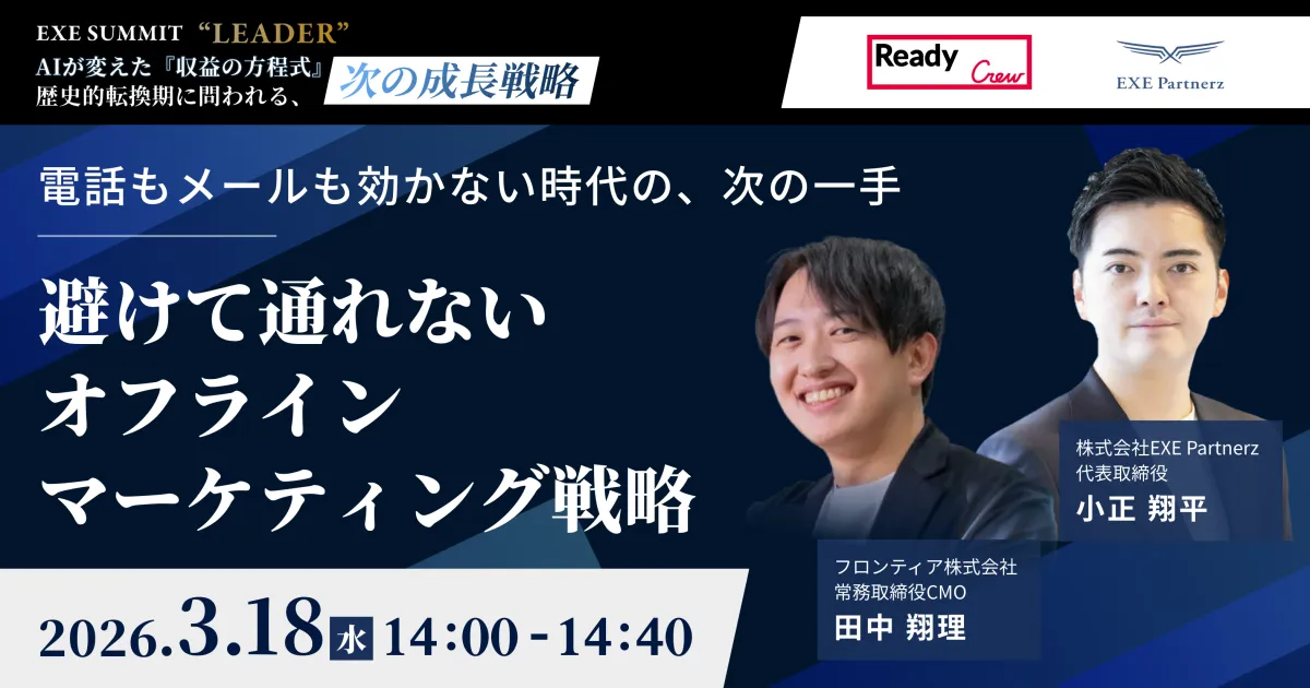 フロンティア株式会社(本社:東京都渋谷区)は、ビジネスマッチングサービス「Ready Crew(レディクル)」を通じて今後のマーケティング手法に対する新たな視点を提供するべく、2026年3月18日(水)に開催されるカンファレンス「EXE SUMMIT 'LEADER'」に参加します。