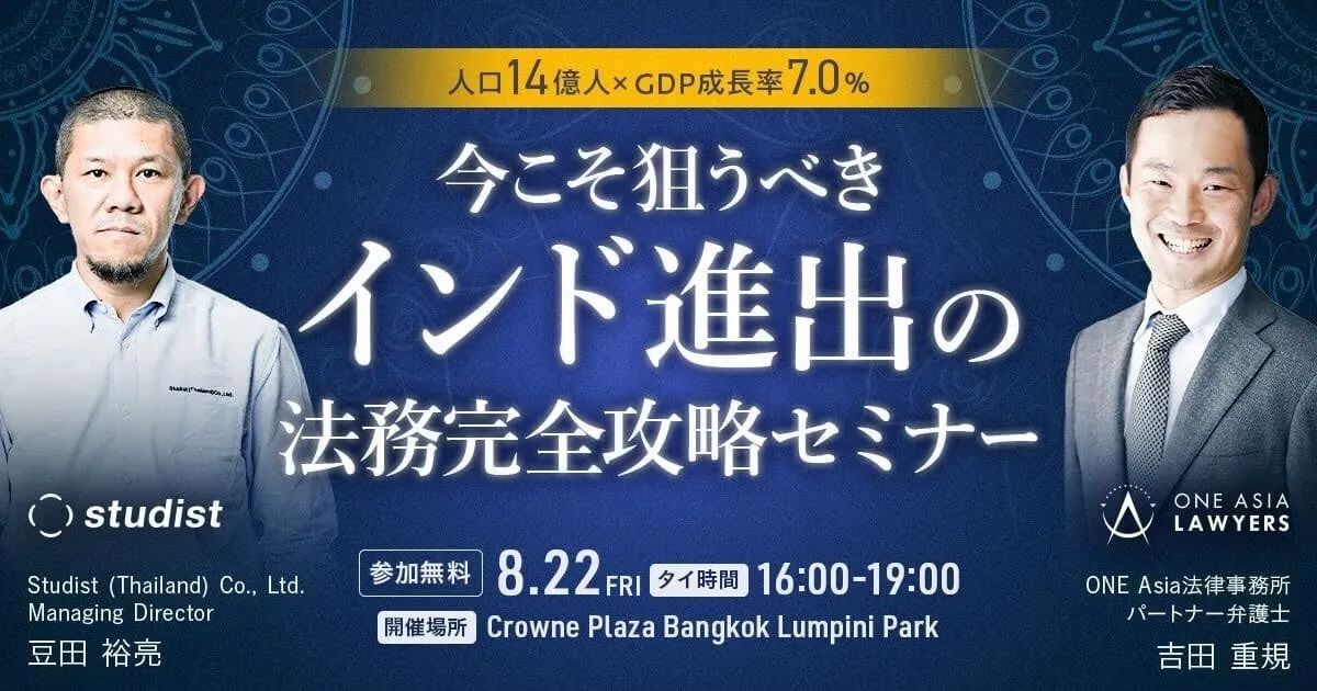 株式会社スタディストが主催する「人口14億人×GDP成長率7.0%!今こそ狙うべきインド進出の法務完全攻略セミナー」が、2025年8月22日金曜日にタイ・バンコクで開催されます。これは新興市場として注目されるインドに進出を考える企業に向けた重要なセミナーです。