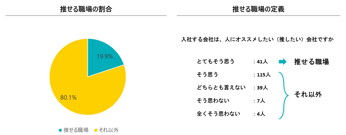 - - フォロー施策への満足度:入社後のフォローが高評価の企業は、推せる職場と認識されやすいという結果も出ています。