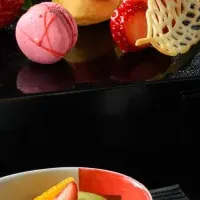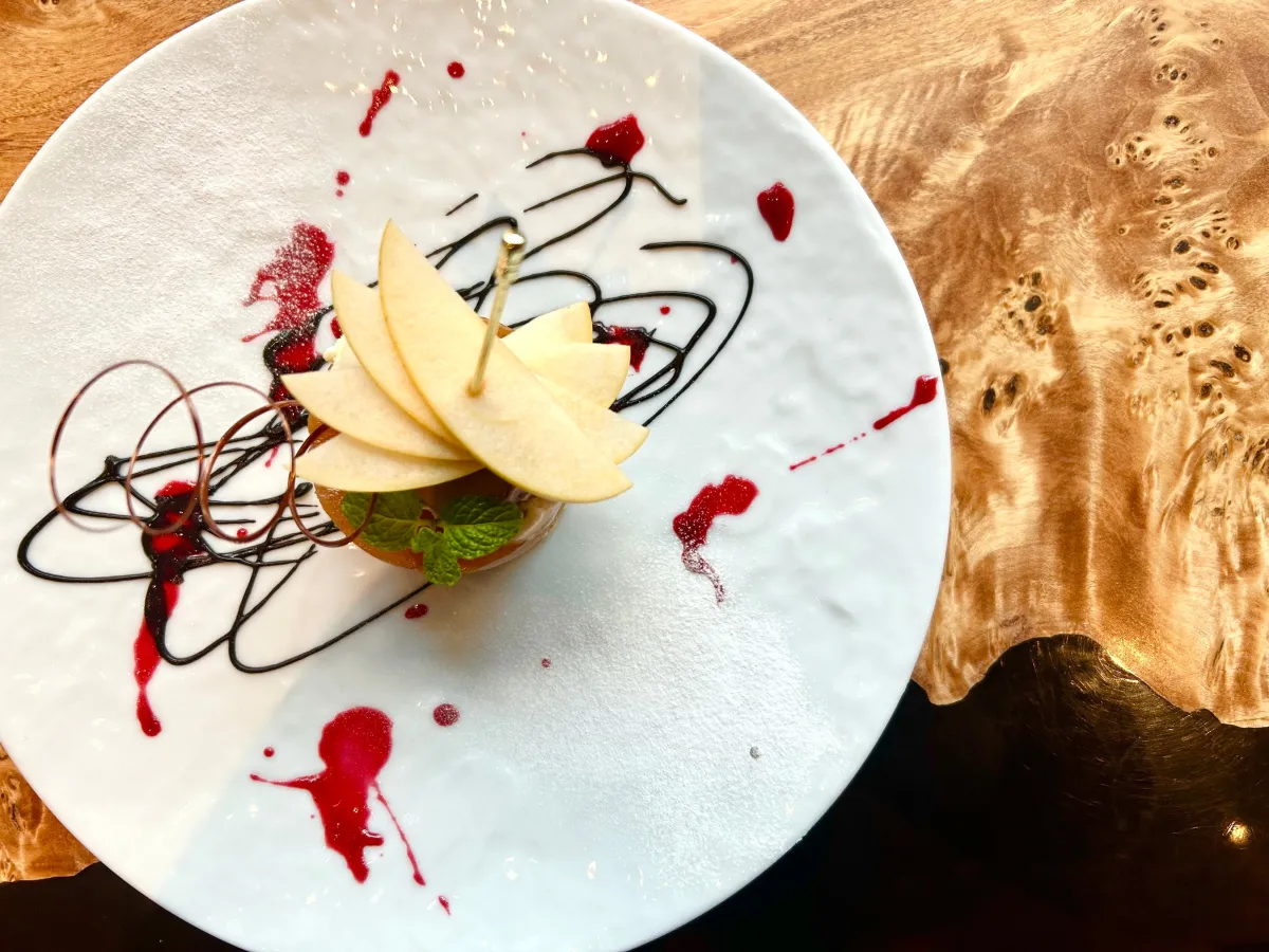 このスイーツは、紅玉りんごのキャラメリゼと、ザクっとしたパイの食感が融合した絶妙な一品です。やさしい甘みとともに、ほろ苦いベルギーショコラが加わることで、味わいが一層引き立ちます。デザートとして、また特別な日の食後にぴったりです。