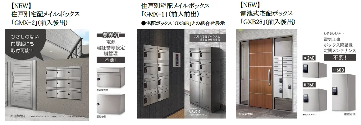 さらに、電源不要で設置が簡単な「電池式宅配ボックス」もラインナップ。エントランス廻りなどの空間に、わずか1台から設置可能で、利便性だけでなく、セキュリティ面でも期待されています。
