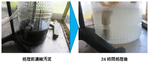 処理開始から数時間後、汚泥は次第に可溶化し、24時間以内には完全に分解・消滅したことが確認されました。従来は、濃縮汚泥状態での完全な分解が困難とされていましたが、今回の結果は活性酸素を用いることでその課題を解消する可能性を示しています。