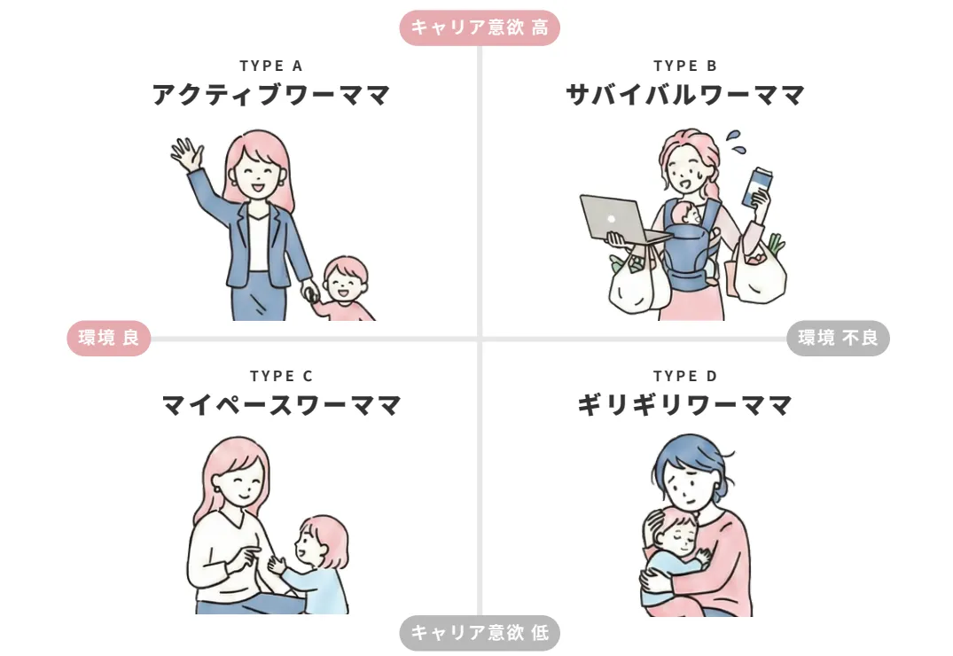 調査では、ワーキングマザーをキャリアに対する意欲と周囲の環境に基づき4つのタイプに分類しています。それぞれが直面する壁や克服方法を知ることができ、これからの育児と仕事の両立を考えるための貴重な情報を得ることができます。