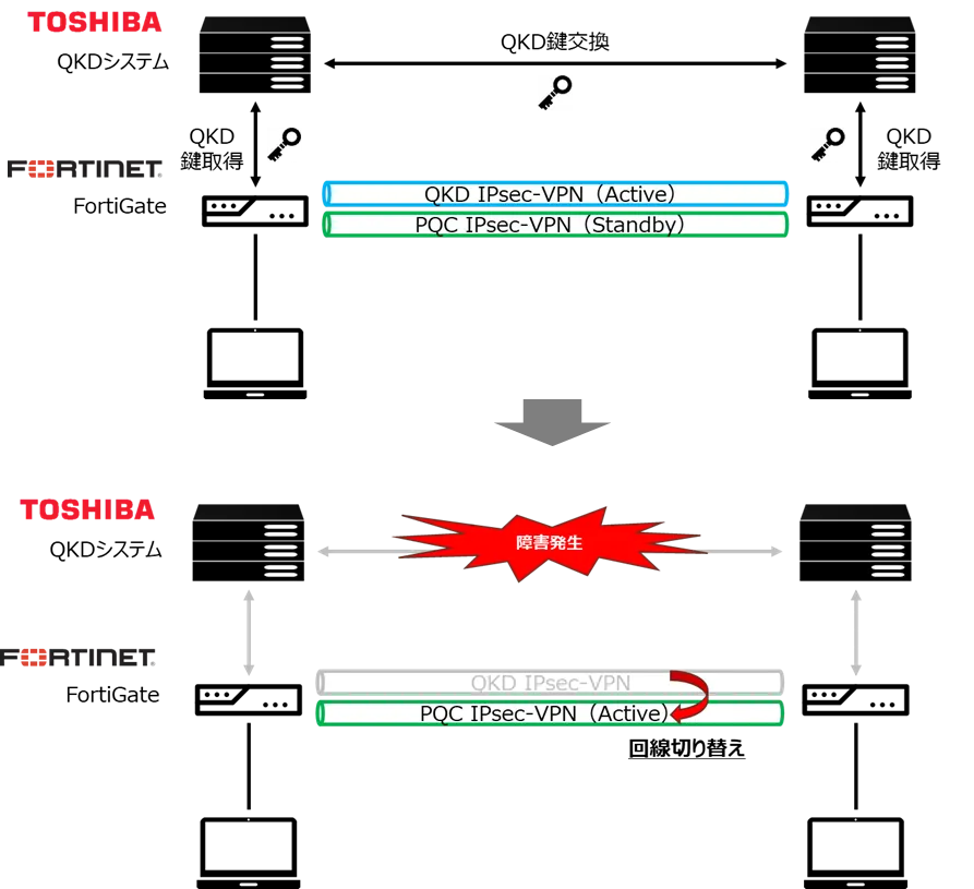 QKDでは、光子を用いた鍵の伝送技術により、暗号鍵の盗聴を検知するシステムを構築。これに加えて、PQCを使用することで耐量子性のある回線を冗長化しました。具体的には、QKDとPQCをそれぞれ用意し、障害時や攻撃を受けた場合にはPQC切り替えで迅速に運用を維持する体制を整えました。このシステムにより、インターネット接続の際のユーザー体験を損なうことなく、スムーズに通信の切り替えを実現しています。