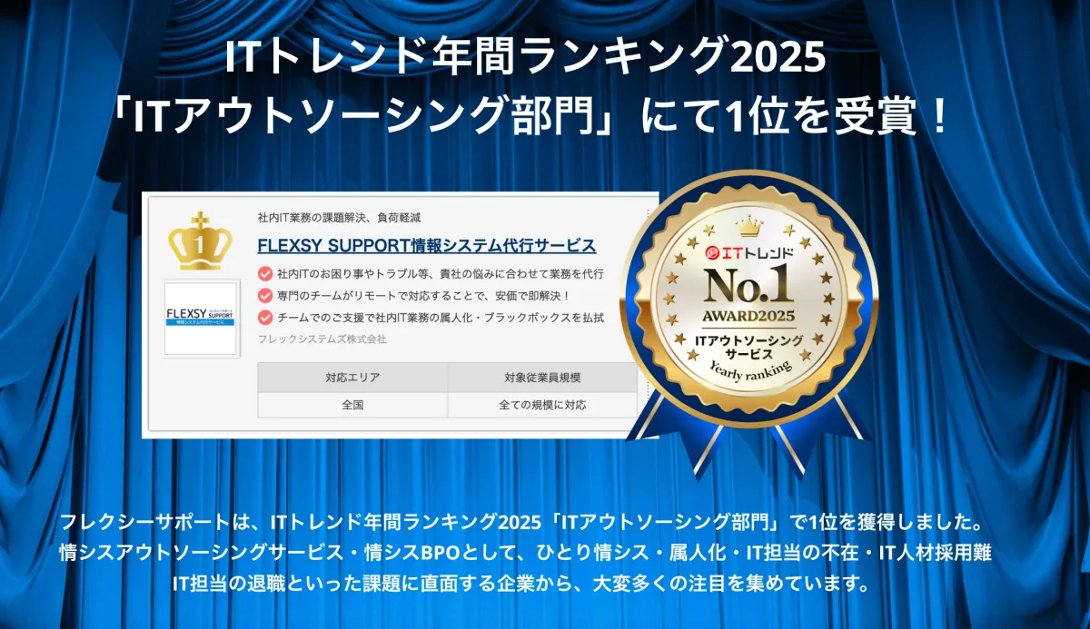 フレックシステムズ株式会社が提供する情シスアウトソーシングサービス「フレクシーサポート」が、国内最大手のIT製品比較サイト「ITトレンド」の年間ランキング2025において、ITアウトソーシングサービス部門で【総合】と【急上昇】の2部門から第1位を獲得し、ダブル受賞を達成しました。この快挙は、特に企業の情報システム部門における深刻な人材不足が続く中、フレクシーサポートの取り組みが大きく評価された結果と言えるでしょう。