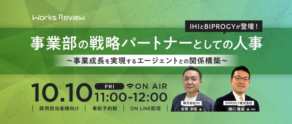 株式会社ワークス・ジャパンが主催する『WORKS REVIEW』は、2025年10月10日(金)に『IHIとBIPROGYが登壇!事業部の戦略パートナーとしての人事 ~事業成長を実現するエージェントとの関係構築~』というテーマでオンラインフォーラムを開催します。このセミナーは、企業の人事担当者や人材開発担当者を対象にしたもので、参加は無料です。